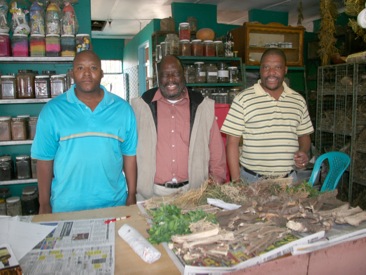 Protus Cele with his two sons who run the day-to-day operations of the business allowing him to be more active in Mwelela Kweliphesheya (Traditional Healers' Council). Mwelela Kweliphesheya is a development arm of KwaZulu- Natal Indigenous Healers that includes the Umgogodla Wesizwe Trust, an HIV/AIDS task team directing efforts to improve the care and treatment of South Africans with HIV/AIDS. The Council is working closely with the Nelson R. Mandela School of Medicine/University of KwaZulu-Natal in Durban in an effort to build bridges and improve collaboration with traditional healers caring for people with HIV/AIDS. (Photo by Aukram Burton)